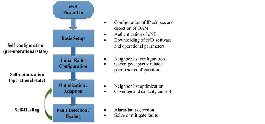 ・ 3GPP (Rel. 9) [6] [7] [8]. Self-Configuration deals with the wireless network in an automated manner from basic setup of eNodeB to initial radio configuration. Under the umbrella of self-configuration, it can automate the configuration of IP address, detection of OAM & P, gate way (GW) setting, downloading of eNodeB software, neighbor list configuration, coverage and capacity of related parameters that minimize the human efforts and the cost efficient way for mobile operators to reduce the network expenses. Self-confi-