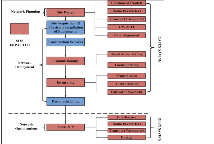 physical installation of equipment and construction services (lease site, purchase equipment and softwares). These manual activities do not have any role of SON. In this phase, commission and integration of wireless network have a strong relationship with self-configuration and self-deployment. In commissioning and integration, normally engineers and technicians are attached with faulty or new cell site to configuring and integrating the installed equipments with core network. Self-configuration function promise with WSP to reduce such manual tasks in cost efficient way.