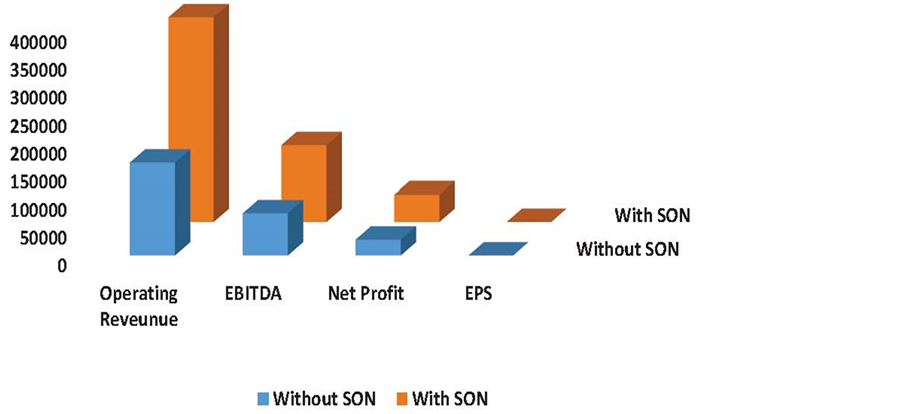 Figure 4 captures the graphical representation of the operating revenues, EBITDA, N.P and EPS of WSP among SON. And the results show that the performance with SON is better than without SON.