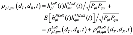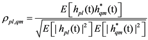 where p and q are two transmitting antennas. l and m are two receiving antennas. hpl(t) represents channel response of antenna p to l. In the same way, hqm(t) represents channel response of antenna q to m. E[•] is expectation. ρpl,qm is correlation coefficient between received signal of antenna l and m.