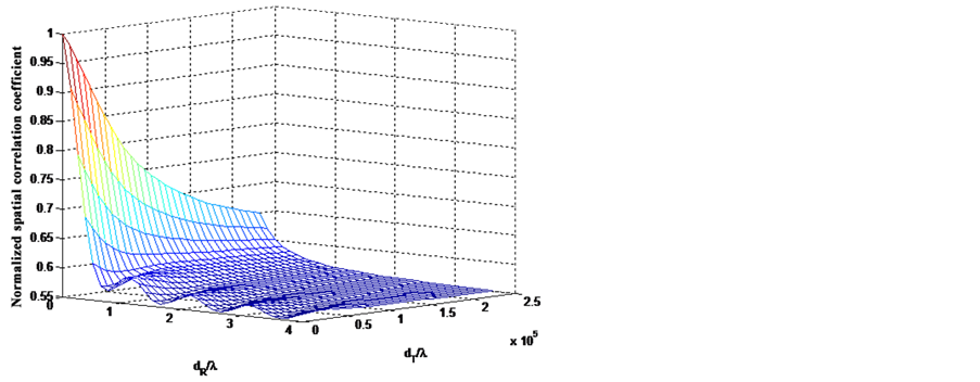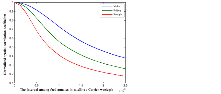 Take Beijing as example, let K = 4 dB, Figure 6 shows the relationship among the interval of satellite antennas, ground antennas, and the spatial correlation