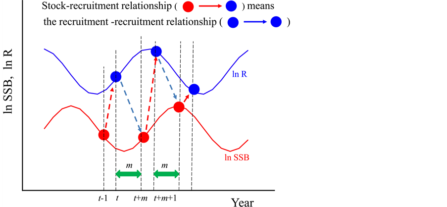 Recently, Sakuramoto proposed a new concept of SRR mechanisms [8] - [13] and showed the mechanisms that explained clockwise or anticlockwise loops emerged in the SRR, using a simulation study. That is, when recruitment, R, fluctuates cyclically in response to environmental factors, and the spawning stock biomass (SSB) also fluctuates cyclically with a time lag (mainly determined by age at maturity), the SRR shows a clockwise loop or an anticlockwise loop for each period of environmental change. The former occurs when age at maturity is less than half of the environmental cycle, and the latter occurs when age at maturity is more than half of the environmental cycle.