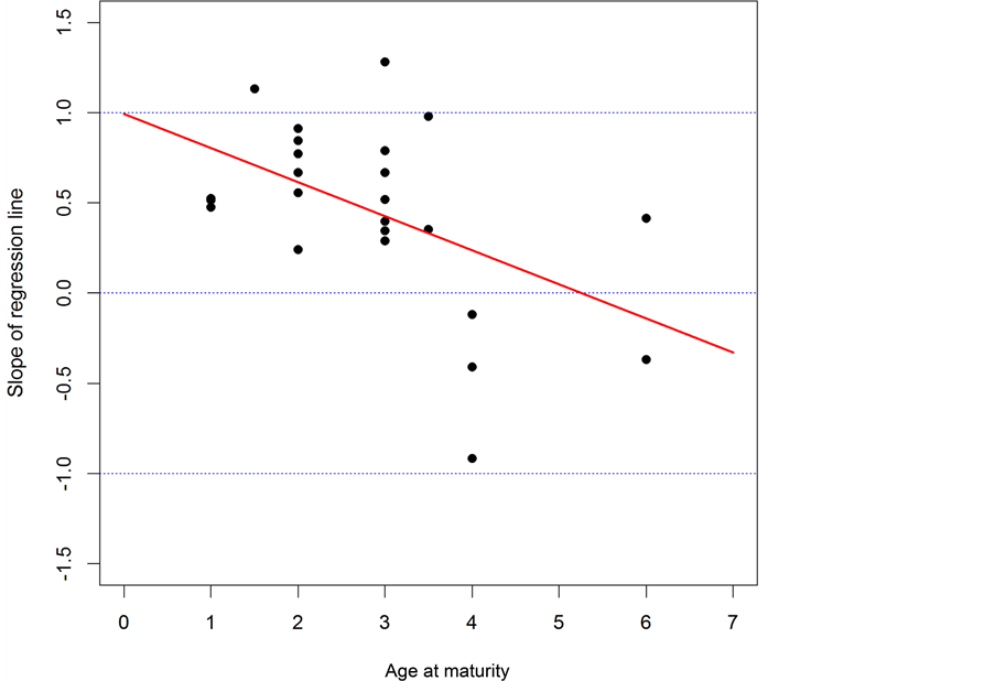 3) The slope of the regression line for SRR had a negative correlation with the age at maturity. When the age at maturity was low, the slope was positive but less than unity. When the age at maturity became high, the slope decreased to zero, and as the age at maturity increased further, the slope became negative.
