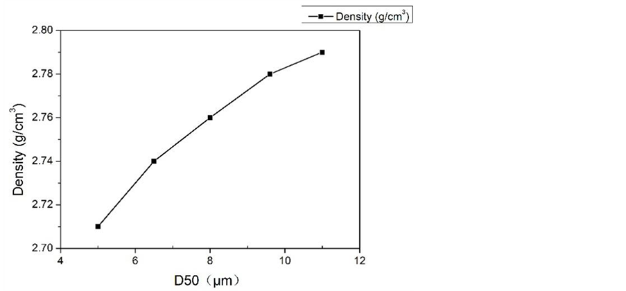 The dielectric property, tensile strength and thermal expansion of the substrate composites were significantly influenced by the density property. The variation of density of substrate composites with respect to TiO2 particle size is shown in Figure 1. As the D50 increased from 5 μm to 11 μm, the relative density of the substrate displayed a continuously increase. Obviously, with the TiO2 particle size increased to 11 μm, the density reached the maximum value of 2.80g/cm3. The main reasons for this are the ceramic powders trend to agglomerate with the