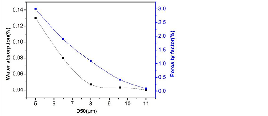 Figure 2. Variation of water absorption and porosity factor with respect to TiO2 particle size.