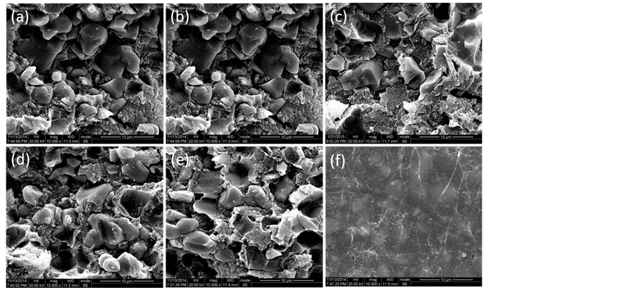 The cross sectional SEM images of TiO2/PTFE composites are shown in Figures 3(a)-(e). The filler particle size changed from 5 μm to 11 μm in successive. It can be seen that all samples exhibit two-phase structure viz. PTFE and ceramic powder. Since PTFE has a low surface energy, it is difficult for ceramic powders to have a good adhesion with PTFE. Many pores can be observed in all images. As particle size increases, a denser microstructure with lesser pores is observed. Sample showed well-dense and homogeneous microstructure when D50 = 11 μm. The typical planar SEM micrograph of D50 = 11 μm is shown in