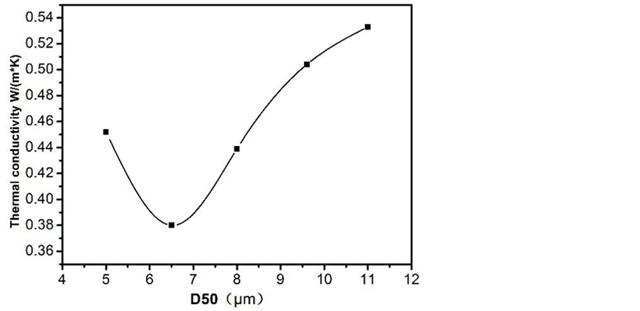 The variation of thermal conductivity of the composites as a function of D50 is shown in Figure 5. The thermal conductivity displayed a decline at first, and then increased slowly after λ dropping to the minimum value of 0.38 W(m℃)−1. The surface area of ceramic powder increased with the decline of D50, which result in the sharply increasing of interface region. Since more interface region means worse contact between ceramic powder and PTFE, this region would deteriorate the thermal conductivity. However, the main reason why λ has an increase when D50 = 5 μm is that the agglomeration of ceramic filler leads to in