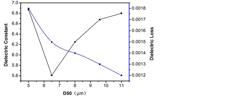 The dielectric properties of the substrate composites depend on not only the dielectric properties of the components but also other factors such as the size of fillers, the interactions between ceramics and polymers, and the dispersion of fillers in polymer matrix [9] [10] [11] [12] [13]. Figure 5 shows the dielectric constant and loss tangent of the composites as a function of D50 of TiO2 particle size. The composite has low loss tangent values (<0.002). As the particle size increases, the loss tangent declines sharply and reaches the minimum values of 0.0012 when D50 = 11 μm. As we know, water has unfavorable dielectric properties (εr = 70, tanδ = 35) [3], high water absorption could deteriorate the dielectric property. The relative dielectric constant of the composites show a sharp decreasing trend at first, and then a slight increase after dropping to the minimum value when D50 = 6.5 μm. The changing of relative permittivity was opposite to that of loss tangent in a manner, since relative densities increase with D50 values growing. The main reason for the εr catch the peak value of 6.9 is the high water absorption has promoted the dielectric constant.