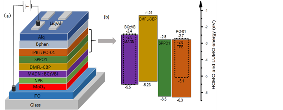 After the 110 nm indium-tin-oxide (ITO) film coated glass substrate with a sheet resistance of 15 Ω/□ is treated by UV-ozone for 15 min, layers of molybdenum trioxide (MoO3),N,N’-di(1-naphthyl)-N,N’-diphenyl-(1,1’-biphenyl)-4,4’-dia- mine (NPB), 2-methyl-9,10-bis(naphthalen-2-yl)anthracene: 4,4’-bis(9-ethyl-3- carbazovinylene)-1,1’-biphenyl (MADN: BCzVBi), DMFL-CBP/SPPO1, 2',2''- (1,3,5-benzinetriyl)-Tris(1-phenyl-1-H-benzimidazole):Iridium(III)bis(4-phenylthieno[3,2-c]pyridinato-N,C2')acetylacetonate (TPBi: PO-01), bathophenanthroline (Bphen), tris-8-hydroxyquinoline aluminium (Alq), lithium quinolate/ aluminum (Liq/Al), which are used as hole injecting layer, hole transporting layer, blue fluorescent emitting layer, double interlayers, yellow phosphorescent emitting layer, hole blocking layer, electon transporting layer, and bilayer cathode, respectively, are subsequently thermally evaporated under a base pressure of 2 × 10−6 Torr. The device structures of the HWOLEDs consist of ITO/ MoO3(10 nm)/NPB (75 nm) /MADN: BCzVBi 7 wt% (20 nm)/DMFL-CBP (X)/ SPPO1 (Y)/TPBi: PO-0.13 wt% (20 nm)/Bphen (10 nm)/Alq (20 nm)/Liq (2 nm)/Al (120 nm), where the sum of “X” and “Y” is 5, and “X” stands for 3 nm, 2.5 nm, 2 nm in Device A, Device B, and Device C, respectively. The schematic diagram and the energy level graph of device strucures are shown in Figure 1(a) and Figure 1(b) [18] [19] [20].