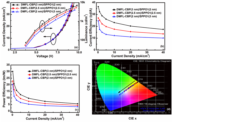 Figure 2. (a) The current density-voltage-luminance relationship; (b) The current effici- ency-current density relationship; (c) The power efficiency-current density relationship of Devices A, B, and C with double intelayers of DMFL-CBP (3 nm)/SPPO1 (2 nm), DMFL-CBP (2.5 nm)/SPPO1 (2.5 nm), DMFL-CBP (2 nm)/SPPO1 (3 nm), respectively; (d) The CIE(x,y) coordinates of the three devices, in which the square, circle, and triangle symbol for Devices A, B, and C, respectively. And the direction of the arrow represents the increase trend of applied current density from 0.2 to 1, 2.5, 5, 10, 20, 40 mA/cm2.