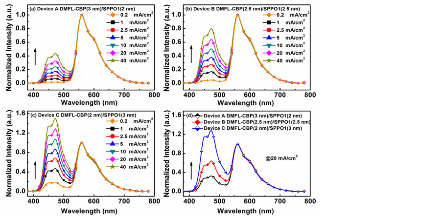 To investigate the physical mechanism in these HWOLEDs, the normalized EL spectra driving at 0.2, 1, 2.5, 5, 10, 20, 40 mA/cm2 are studied and exhibited in Figure 3 with the yellow emission peak intensity (located at 560 nm) as the reference intensity. The proportion of blue emission part in the normalized EL spectrum increased with the increasing current density in each devices. This may be caused by that more singlets are captured by the blue fluorescent emitter