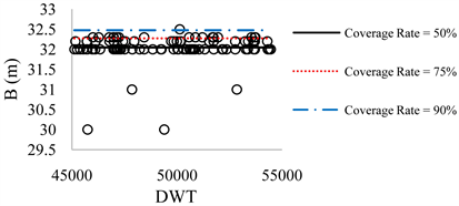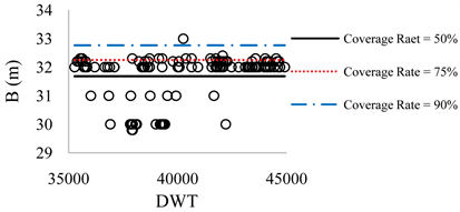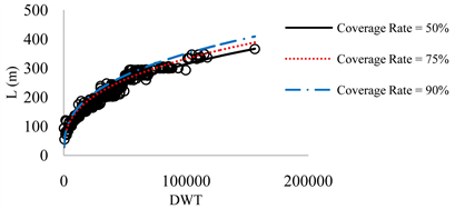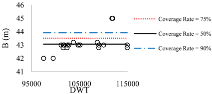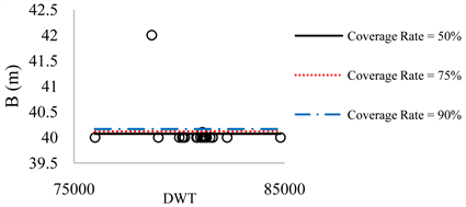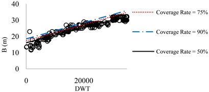 For a specific port it is possible that about 50% of called ships can have bigger dimensions than design values. So, port authorities must be aware of considering safety studies as necessary for the ship with greater dimensions. As it is obvious, increasing the confidence limit will raise the cost of improving port facilities to focus on high service levels. In this study, regression equations according to coverage rates equal to 50%, 75%, and 90% have been set. Here, it is assumed that the distribution of data around the regression equations obeys a normal distribution. This assumption causes a parallel translation form the regression equation of the average value will be obtained from based on the value of conditional standard deviation. The amount of this parallel translation is K*σ; known as conditional standard deviation (CSD) [12].