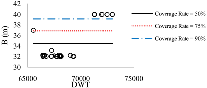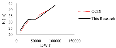 Table 3. Relationship between B (m) and DWT (more than 35,000 t) for container ships.
