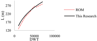 In this section, recommended values of ROM [5] have been compared against the results of current research. Figure 10 shows the results for L. As can be seen, ROM underestimate the length, however the overall correlation is acceptable. Figure 11 shows the results for B. Here, in the midrange results are completely consistent. But, in lower DWTs, ROM underestimates and in the higher DWTs, it overestimates the breadth. The same comparison can be made on D. Table 6 summarizes the quantitative difference between ROM and this research.