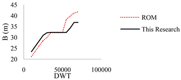 Table 2. Relationship between B (m) and DWT (less than 35,000 t) for container ships.