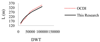 In this section, recommended values of OCDI have been compared against the results of current research. Figure 14 shows the results for L. As L increases, results are spread apart and OCDI overestimates the length. Figure 15 shows the results for B. Here, for DWT > 40,000 t, results are consistent. For lower DWTs, OCDI underestimates the breadth. The same comparison can be made on D. Table 8 summarizes the quantitative difference between OCDI and this research.