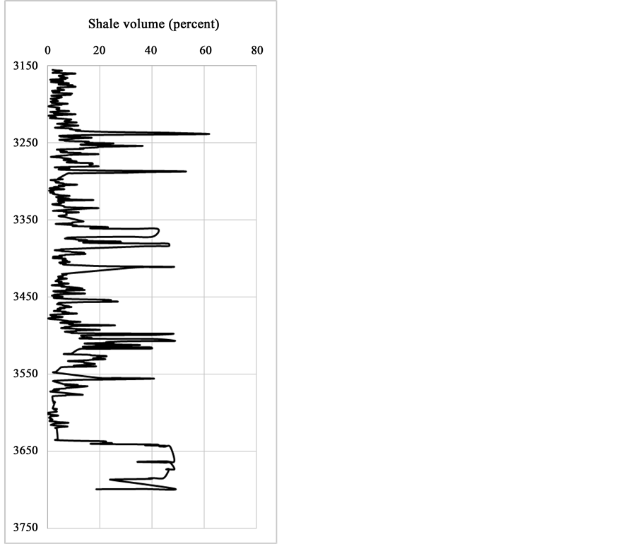 The net thickness (hnet = 368.04) was calculated by remove of the shale, Dense Rock and Wet Rock intervals. Then charts of shale volume percent, the corrected and measured porosity were prepared (Figure 3 and Figure 4).