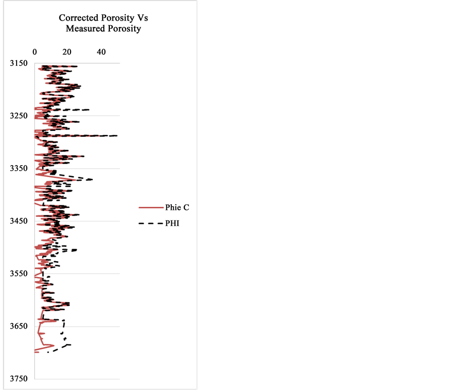 Figure 4. The corrected porosity and measured porosity graphs in the study well.
