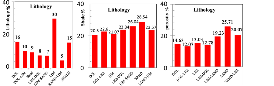 Figure 5. Lithology distribution related to lithology percent, shale percent and porosity percent.