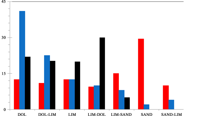 Figure 6. Lithology distribution related to the rock type percent. The good, fair and poor rocks have shown with red, blue and black colors, respectively.