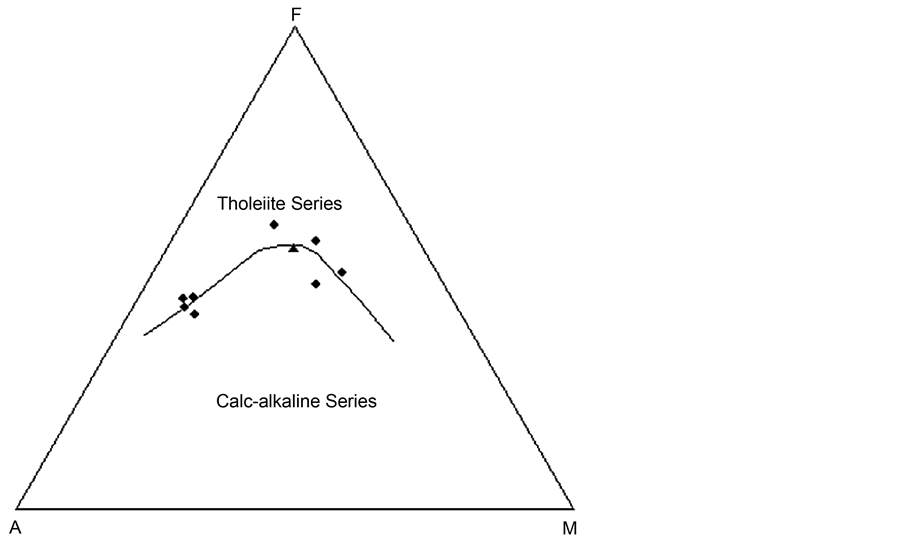 that the samples mostly plot in contact between tholeiitic and calcalkaline field (Figure 7).