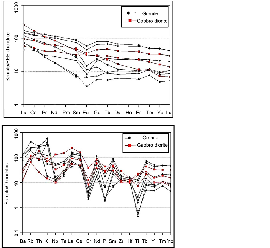 and gabbrodiorite of the XIV prospect. REE concentrations in the granite are higher than those in gabbrodiorites (Figure 8(a)) and the granite has a higher Th/U ratio (2.5 - 7.4) than that of the gabbrodiorite (0.7 - 3.52). The gabbrodiorite of the XIV prospect have lower contents of SiO2 (44.45 to 51.22 wt%) and K2O (0.05 to 3.1 wt%) rather than those of granite. Chondrite normalized REE patterns for the XIV gabbrodiorite show wide compositional variations (Figure 8(a)). They are depleted in HREE and relatively enriched in LREE with LREE/HREE ratios of 4.3 to 42, and have narrow compositional variation with negetive Eu anomalies (Figure 8(a)).