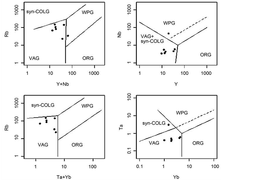 Figure 9. Plot of granitoid rocks from the XIV prospect on the Y + Nb vs. Rb & Y vs. Nb & Tb + Yb vs. Rb & Yb vs. Ta discrimination diagram of Pearce et al. [20] . Abbreviations of fields: VAG: volcanic arc granites; WPG: within plate granites; Syn-COLG: Syn-collisional granites; ORG: ocean ridge granites; Post-COLG: post-collision granites.