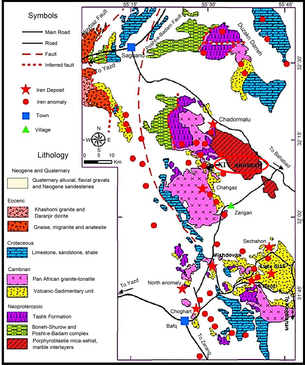 Figure 1. Simplified geological map of the Bafq mining district indicating the location of the XIV iron prospect (Modified from Haghipour, 1977; NISCO, 1980; Ramezani & Tucker, 2003) [9] - [15] .