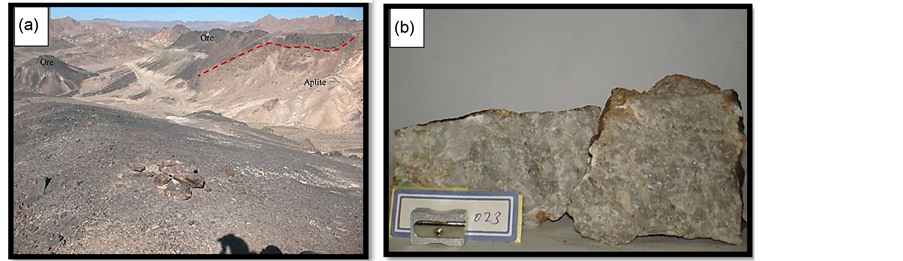 The Zarigan intrusion is the largest intrusive body exposed in the study area. This intrusion is a shallow, leucocratic body that ranges in texture and color from a typical medium-crystalline granite to a sub-volcanic granite porphyry (aplite) (Figure 2(a) & Figure 3(a)) [10] . The first type granites (Leucogranite) are pale-pink (Figure 2(a) & Figure 2(b)) and tend to be alkali granites and have a granular and pertitic texture. The studied granite samples consist primarily of quartz (39%), orthoclase (35%) and plagioclase (oligoclase) (25%) in approximately equal proportions. Accessory minerals include biotite, hornblende, titanite, zircon, and opaque minerals (Figure 2(a)). This