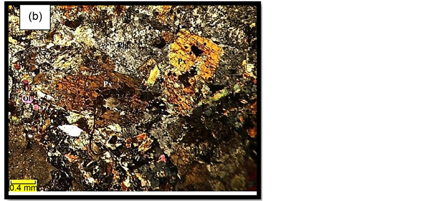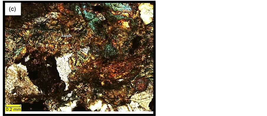 from the XIV prospect, demonstrates the major minerals of pyroxene (25% - 30%), amphibole (10% - 12%) and plagioclase (35% - 40%) (Figure 4(b)) together with accessory minerals of biotite, apatite, olivine, zircon and opaque minerals (Figure 4(c)).