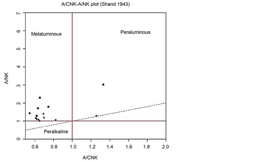 The samples of the XIV granite have SiO2 contents of 62.8 wt% - 72 wt% and Al2O3 contents of 11.99 wt% - 16.41 wt% (Table 1) and are enriched in Na2O (2.19 wt% - 6.78 wt%) and K2O (0.5 wt% - 10.74 wt%), as it is demonstrated in the TAS diagram (Figure 6). These granites are metaluminous with alumina saturation index values (ASI = molar Al2O3/(CaO + Na2O + K2O)) up to 1.10 (Figure 5) and are calcic as indicated by the Rittman index values between 0.8 and 1.4 (σ = [Na2O (wt%) + K2O (wt%)] 2/[SiO2 (wt%) − 43]) and their position on Na2O + K2O vs. SiO2 diagram [18] . There is a general decrease in Al2O3, FeOt and CaO with increasing SiO2 (Table 1).