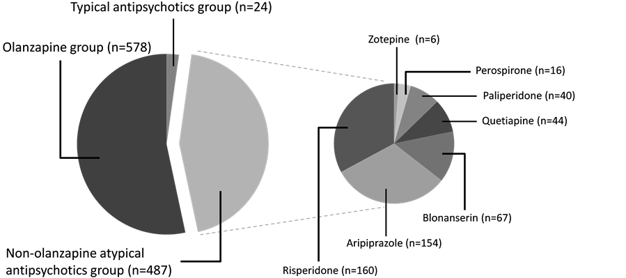 A total of 1124 patients from 72 centers in Japan were enrolled and the study was conducted from January 2010 to November 2012, and assessed for baseline characteristics. Thirty-five patients were not eligible for analysis: 26 for inclusion criteria not met (14, age under 20 years old; 12, concomitant use of multiple antipsychotics) and 9 for lack of case report. Thus, data from 1089 patients were analyzed. Among those, 578 patients were treated with olanzapine, 487 with non-olanzapine atypical antipsychotics (including 160 risperidone, 154 aripiprazole, 67 blonanserin, 44 quetiapine, 40 paliperidone) and 24 with typical antipsychotics (including 13 haloperidol) (Figure 1).
