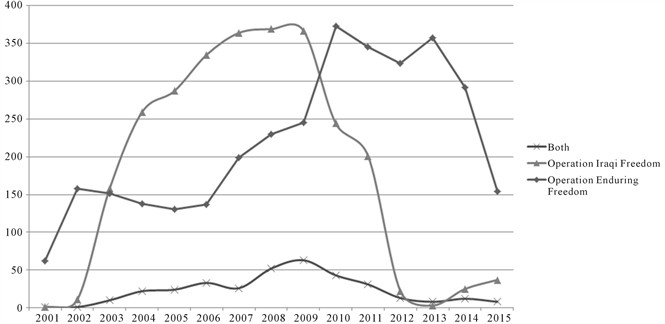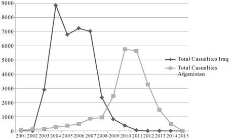 Figure 1. US combat casualties in Operation Enduring Freedom and Operation Iraqi Freedom, 2001-2015.