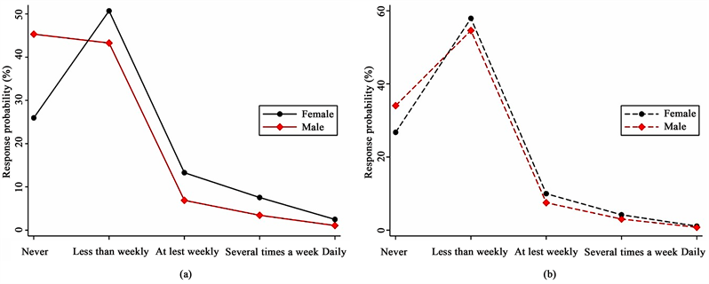respectively. The smallest difference in probability is found for the highest frequency of usage. Here, the difference is only 1.43 percentage-points. Interestingly, when adding control variables (see Table 5 and Table 6) most of the gender-based difference evaporates.