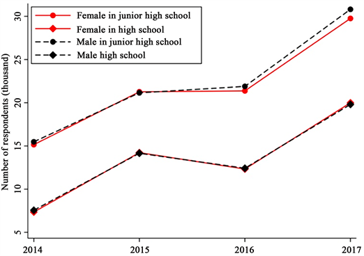 A total of 284,674 respondents participated in the survey between 2014 and 2017 drawn from all 19 counties in Norway. Figure 1 shows temporal development in participation across both gender2 and school level. As observed, the number of self-identified females and males are fairly equal. Males tend to outnumber females for lower percentiles of age, but the discrepancy is more likely driven by gender-based heterogenous willingness to participate and dropout rates. Participation across junior high school and high school, however, experience a more prominent discrepancy, but the number of participants from high-school appears to be colinear with number of participants from high school. As enrolment in junior high school is mandatory while high school is optional, the discrepancy is to be expected.
