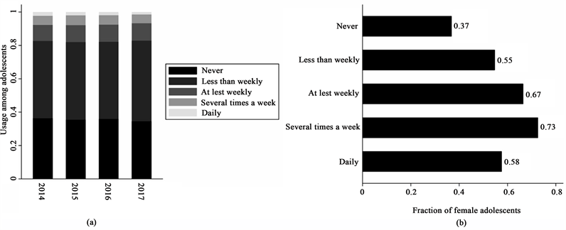 Figure 2. Reported usage of prescription-free painkillers among Norwegian adolescents (20142017). (a) Variation across time; (b) Variation across gender