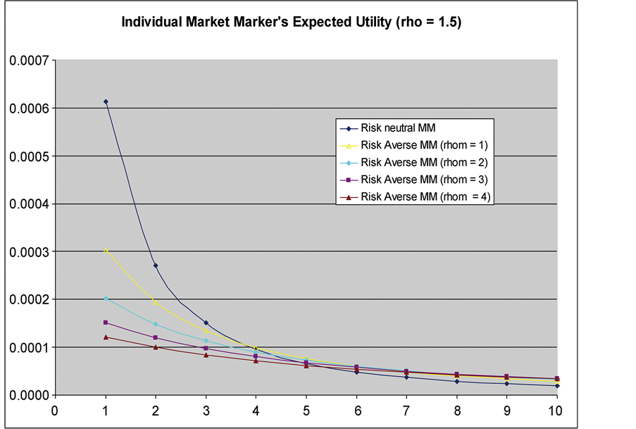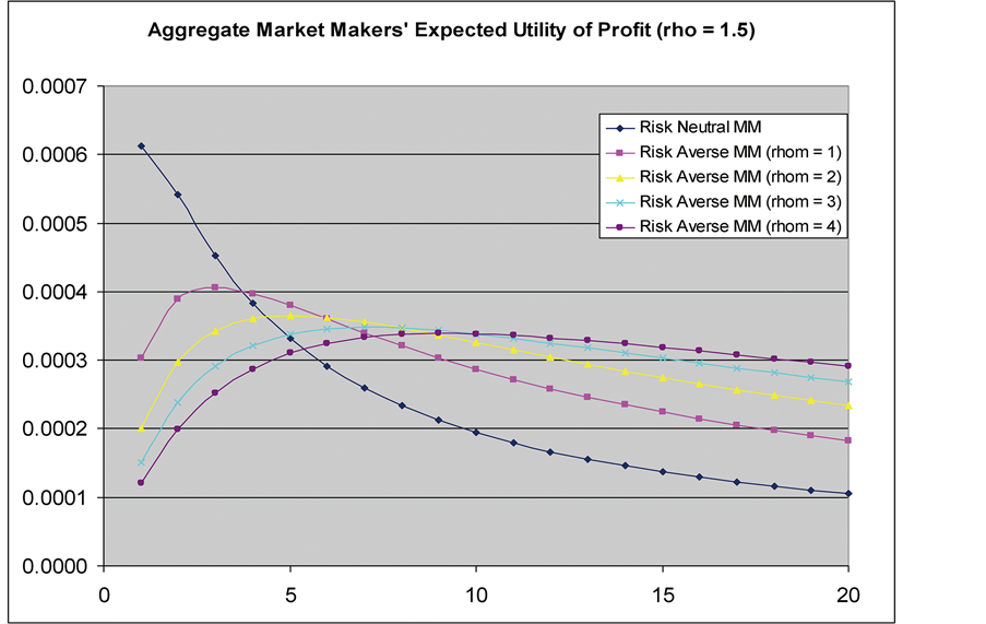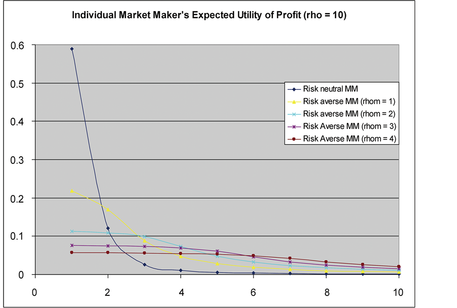 Figure 5 and Figure 6 show the individual expected utility of profit for the market makers as a function of N, the number of market makers, and