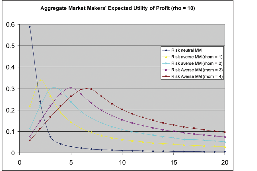 Figure 7 and Figure 8 show the aggregate expected utility of profit for the market makers as a function of their number and their risk aversion. The aggregate expected utility of profit for the market makers represents how market makers fare as a group.