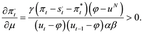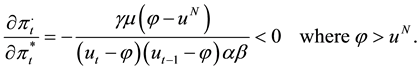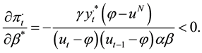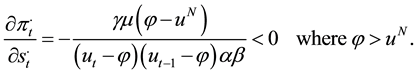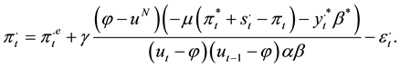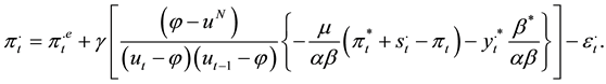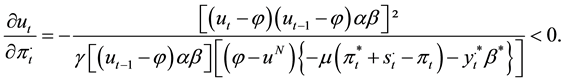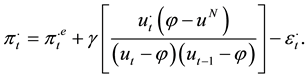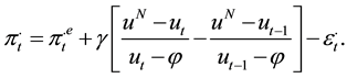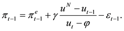 and it denies the impartiality of inflation from the exogenous shocks. It implies that any stochastic shock to the economy consequently fluctuating inflation would lead to a variation in unemployment from its natural rate. According to Tambakis [15] , differentiating the Equation (2) explains the original Phillips curve’s claim that if the unemployment rate goes below its natural rate, the cost push inflation would grow more than it would grow if the unemployment rate falls at high levels. Such as: