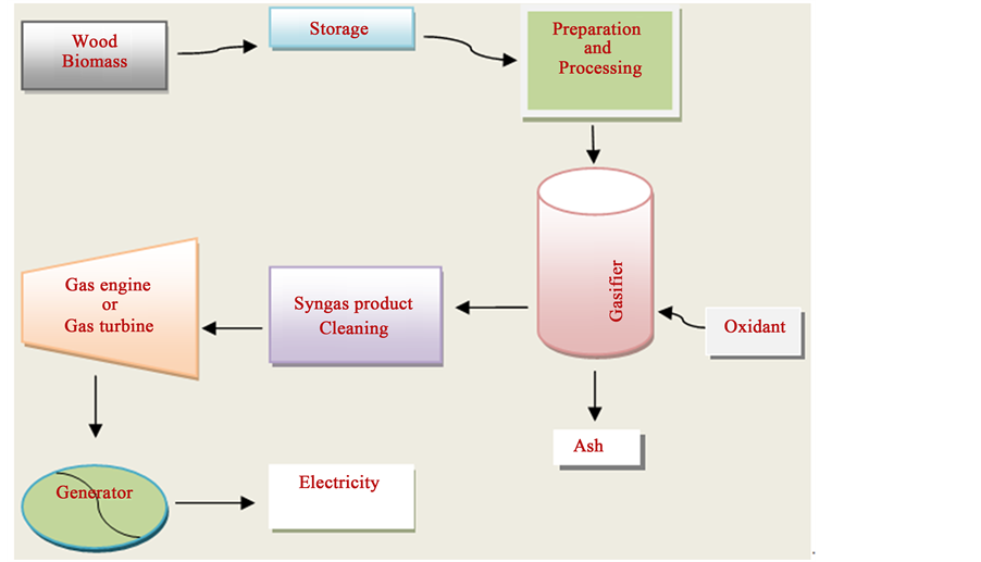 Internal combustion engines, which are typical of energy systems employed in the rural areas of developing countries (including Nigeria), are widely used in stationary applications, e.g. the operation of water pumps and mills, and for lighting purposes. A technology such as gasification (Figure 4), which involves the conversion of biomass wood fuel into electrical power, could play a prominent role in accomplishing these. According to Anjireddy and Sastry [44] , many developing countries are either in the process of evaluating biomass gasification technology or actually just introducing small-scale biomass gasifiers. Besides using wood as fuel for cooking, gasification of these resources offers a better option for producing power, heat and biofuels for a wider variety of applications. With renewed focus on producing energy from biomass wood waste, it is both possible and encouraging to know that wood waste can be converted using the existing infrastructure and equipment associated with fossil fuels such as coal [45] . It is also important that biomass energy takes the largest share of power generated by non-hydroelectric sources, which includes co-generation and co-firing in coal-fired power plants [45] . Gasification is basically a thermo-chemical process that converts biomass materials into gaseous components, with the reaction taking place in a reactor called a gasifier. The process of gasification as presented in Figure 4 involves loading of the already prepared and processed wood waste as fuel reactant into the gasifier. This is followed by reaction with gasifier agent (steam/oxygen) at relatively high pressure usually higher than 30 bars and at a temperature as high as 1500 K to produce raw synthetic gas (CO + H2), hydrogen and some other minor byproducts. The syngas is cleaned and eventually used to generate electricity.