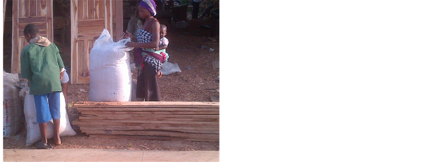 Figure 2. Domestic collection and dumping of wood waste in and around a Nigerian sawmill. Photos: Babafemi Oyebamiji.