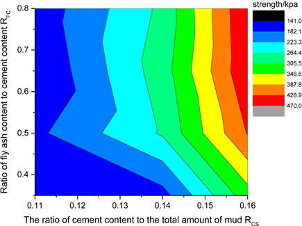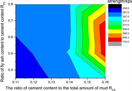 the curing time are in an increasing relationship. When the ratio of cement is RCS = 0.11 - 0.16 and the amount of fly ash is RFC = 65% - 80%, the strength at 28d curing age is 1.25 - 1.6 times the intensity of 14 d. However, when the amount of cement and fly ash is relatively small, the effect of curing time on strength is not obvious. When the curing time is short, the effect of cement on the strength of the solidified soil is greater than that of the fly ash. This also means that the solidifying agent of fly ash must function after reaching a certain value at the age.