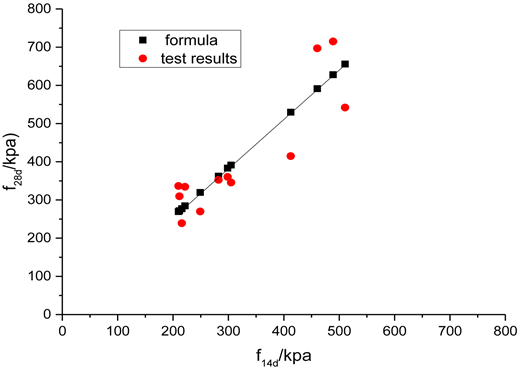 the relationship between curing time and strength. It can better judge the strength and provide valuable reference for the project. It can be seen that the intensity of 14 d is 1.23 times higher than that of 7 d, and the intensity of 28 days is 1.29 times higher than that of 14 d.