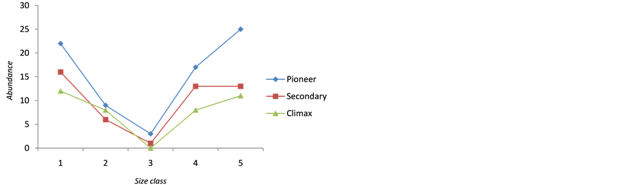 Categorization of natural regeneration of species between ecological groups grouped into size classes resulted in the data listed in Table 2.