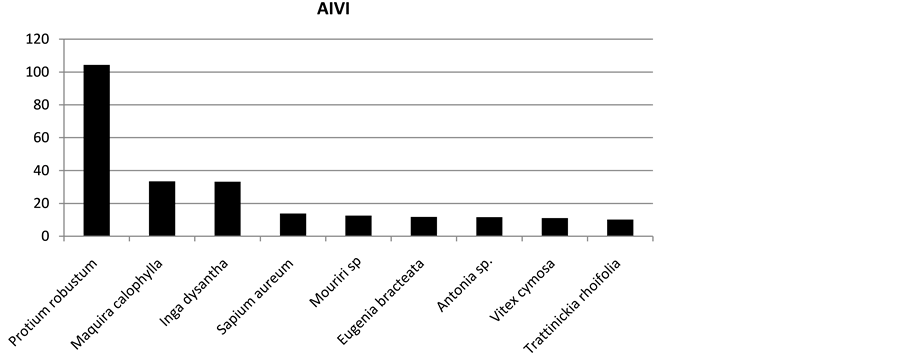 The species with the highest importance values obtained AIVI refer to tree and shrub species, highlighting the Protium robus- tum, a timber kind suffering strong pressure exploration in the Amazon region; however it is noted that the species responds positively to the processes natural regeneration. Figure 4 graph- ically illustrates the species that showed best AIVI.