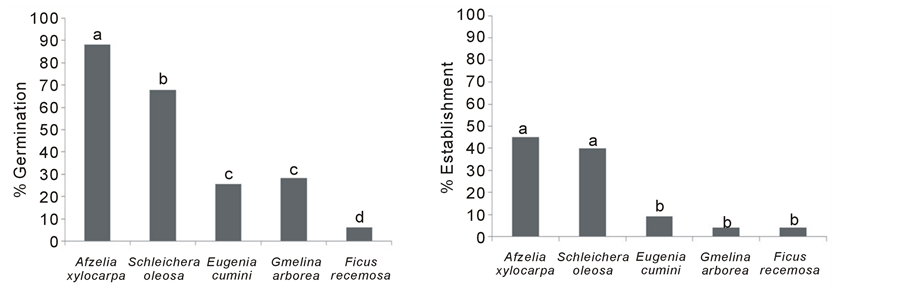 Lastly, F. racemosa was unacceptable for direct seeding, because of low percent germination and long dormancy Figure 1(a) & Figure 1(c). Fig seeds are tiny. They do not contain sufficient food resources to support early seedling growth, which probably makes them unsuitable for direct seeding (Kuaraksa & Elliott, 2013; Hua, 1997).