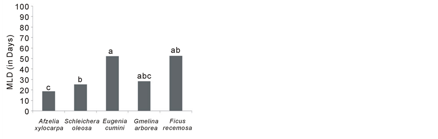 Germination percentages, averaged across all treatments, differed significantly among species (p < 0.05). Highest germination was achieved by A. xylocarpa 88% and lowest by F. racemosa 5.9%. T-tests revealed that percent germination of Afzelia xylocarpa and Schleichera oleosa was significantly higher than that of other species, across all treatments. Three species exhibited rapid germination (i.e. short MLD) (A. xylocarpa, S. oleosa and G. arborea) (p < 0.05).