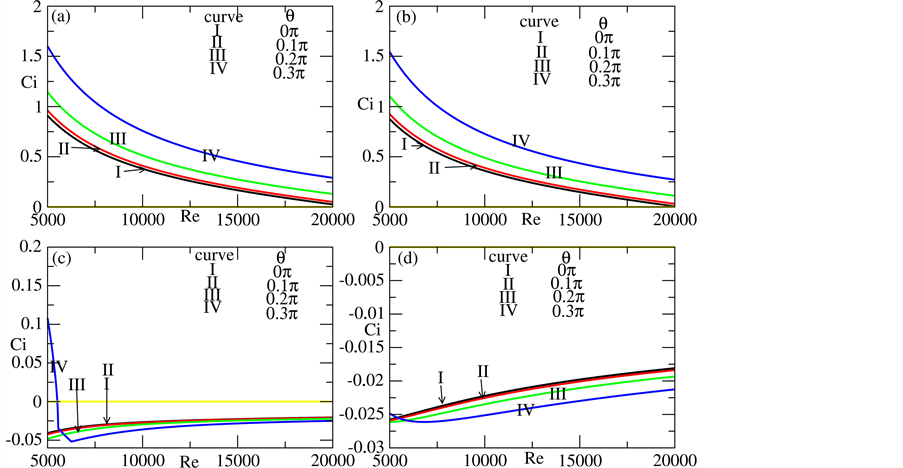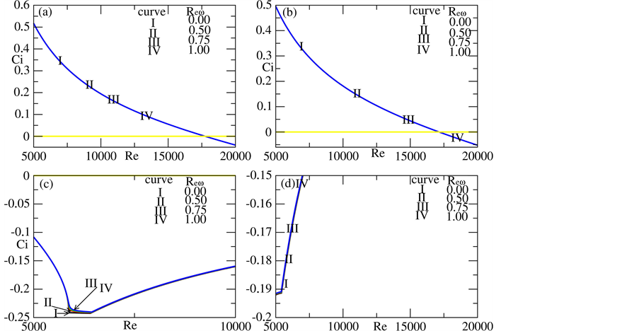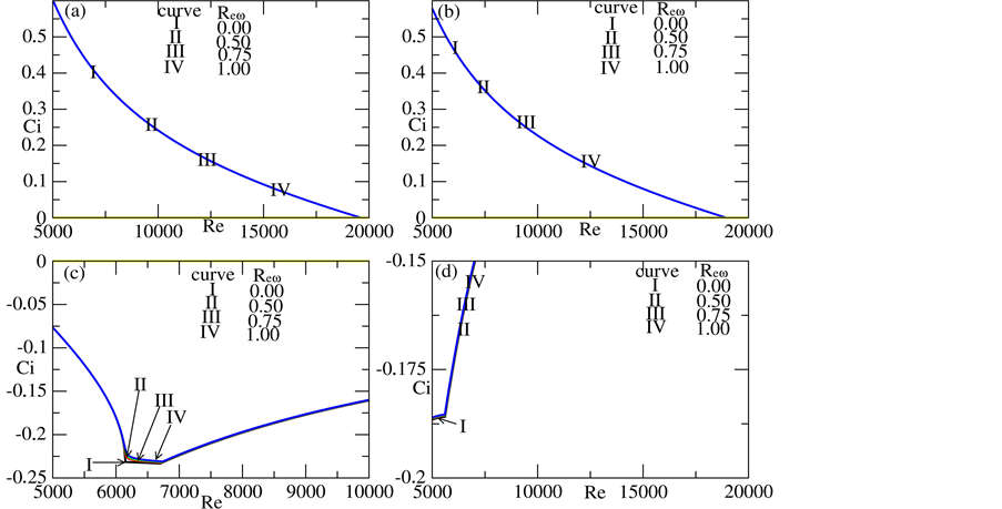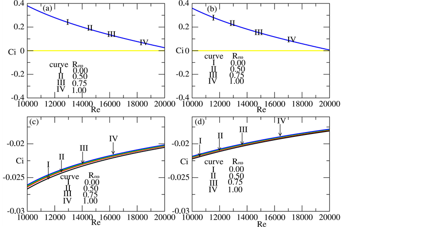 Figure 2 presents the effect of injection/suction Reynolds number on linear temporal stability of viscous incompressible electrically non conducting fluid ( ) flow for different values of wave number. It is observed that for and (frames a and b), the stability is not affectd by and the flow is unstable but for and (frames c and d), affects the stability, and the flow stays stable, but increasing of doesn’t contribute to the stability.
