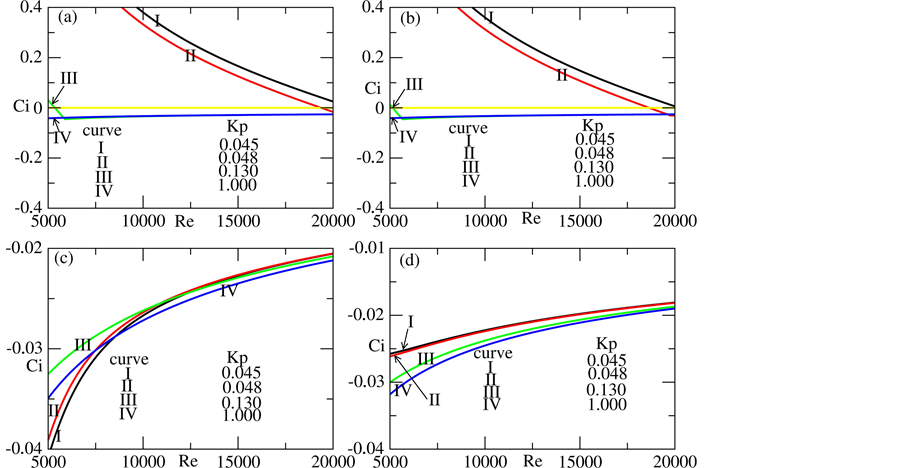 Figure 3 exhibits the effect of permeabilty parameter on linear temporal stability of viscous incompressible electrically non conducting fluid flow for different values of wave number. It is observed that affects the stability. For and , the frames and show that for the flow is unstable (curves I) and stable for (curves IV) but for and (curves II, III), we have the transition of the flow (See Table 1 for the criticals hydrodynamic Reynolds number values). For and (frames and ) the flow is completely stable. On careful observation, we remark that for , increasing of contributes to the stability in frame case, and the opposite is noticed in the frame case, but when , increasing of contributes in the both cases. Thus, it