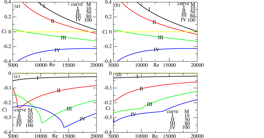 Figure 4 shows the effect of Hartmann parameter on linear temporal stability of viscous incompressible electrically conducting fluid flow for different values of wave number. It is observed that affects the stability. For and , frames and show that for the flow is unstable (see curves I) and stable for (see curves IV) but for and (curves II, III), we have the transition of the flow (See Table 1 for the critical Reynolds number values). For and (frames and ) the flow is completely stable. Thus, we may concluded that the Hartmann parameter increasing contributes more to the flow stability.